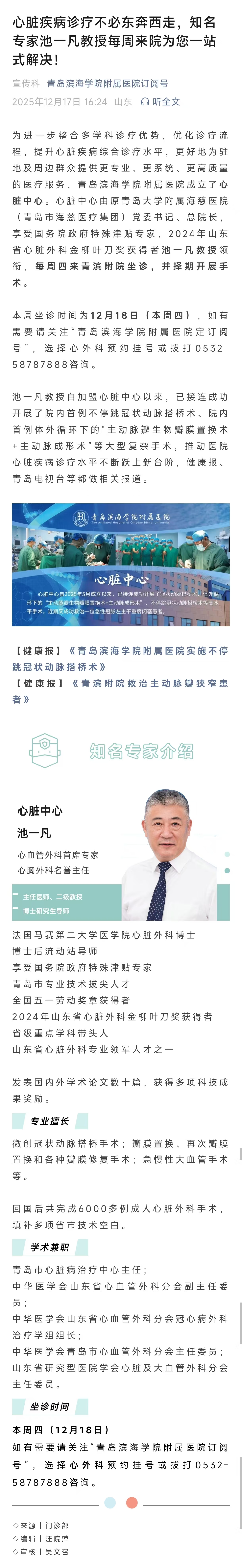心脏疾病诊疗不必东奔西走,知名专家池一凡教授每周来院为您一站式解决!