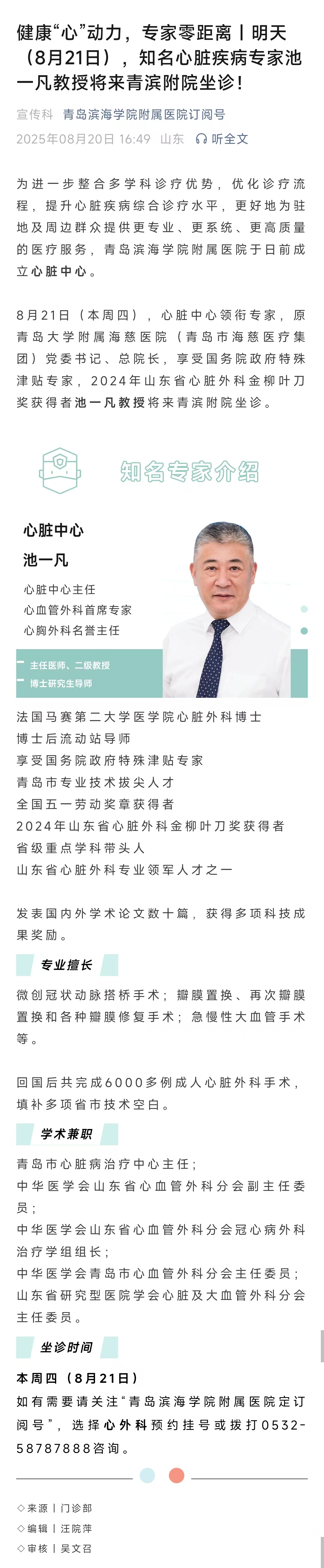 健康“心”动力,专家零距离|明天(8月21日),知名心脏疾病专家池一凡教授将来青滨附院坐诊!