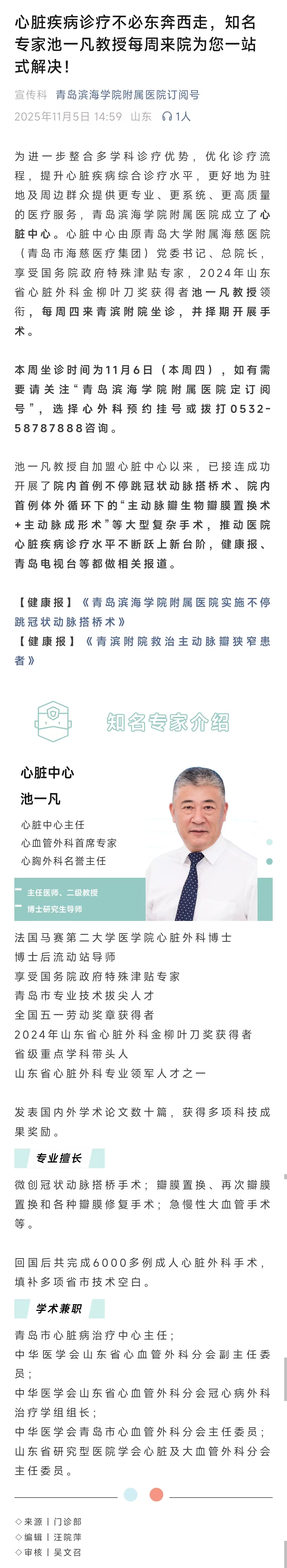 心脏疾病诊疗不必东奔西走,知名专家池一凡教授每周来院为您一站式解决!