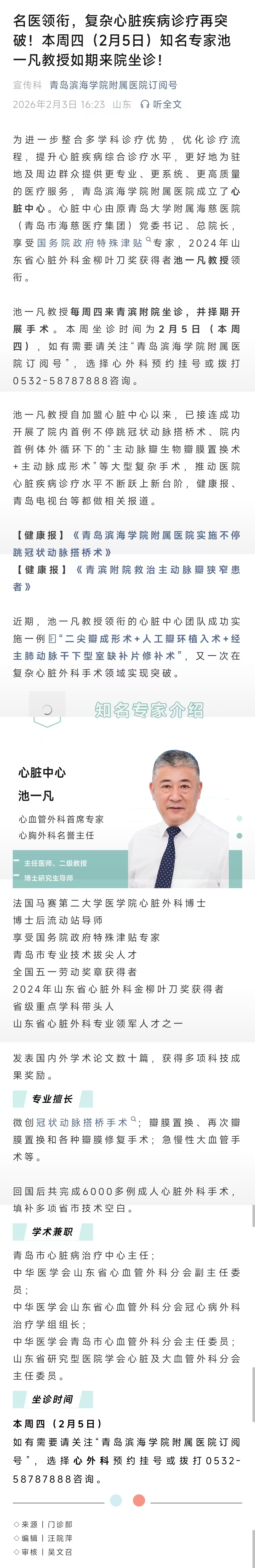 名医领衔,复杂心脏疾病诊疗再突破!本周四(2月5日)知名专家池一凡教授如期来院坐诊!