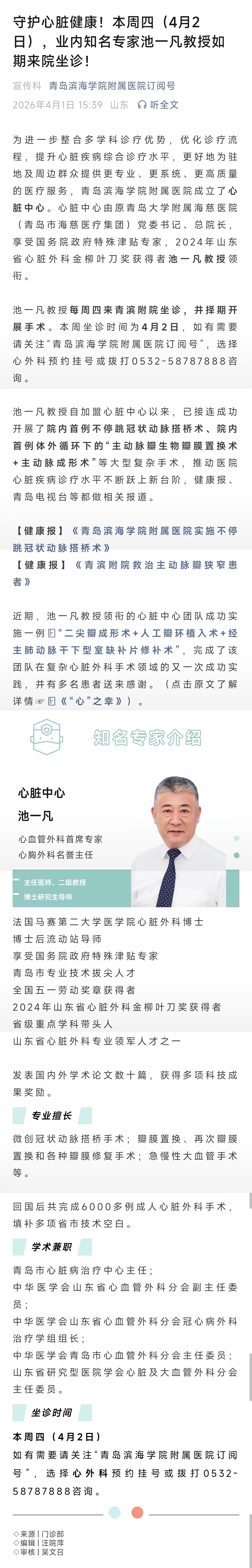 守护心脏健康!本周四(4月2日),业内知名专家池一凡教授如期来院坐诊!