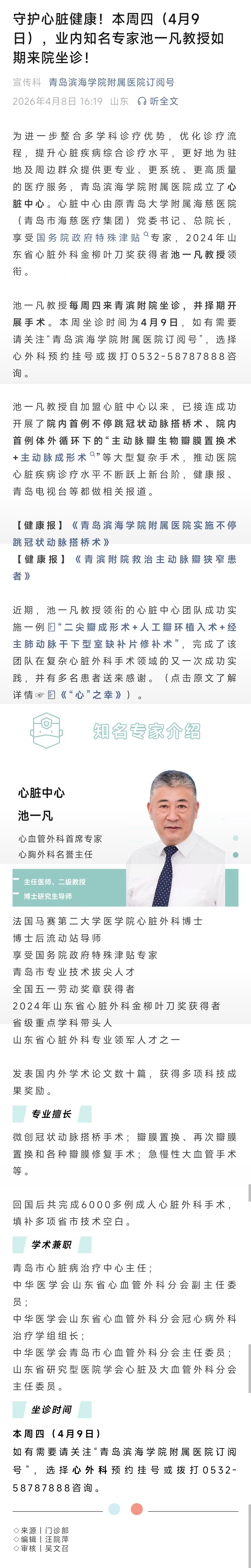 守护心脏健康!本周四(4月9日),业内知名专家池一凡教授如期来院坐诊!