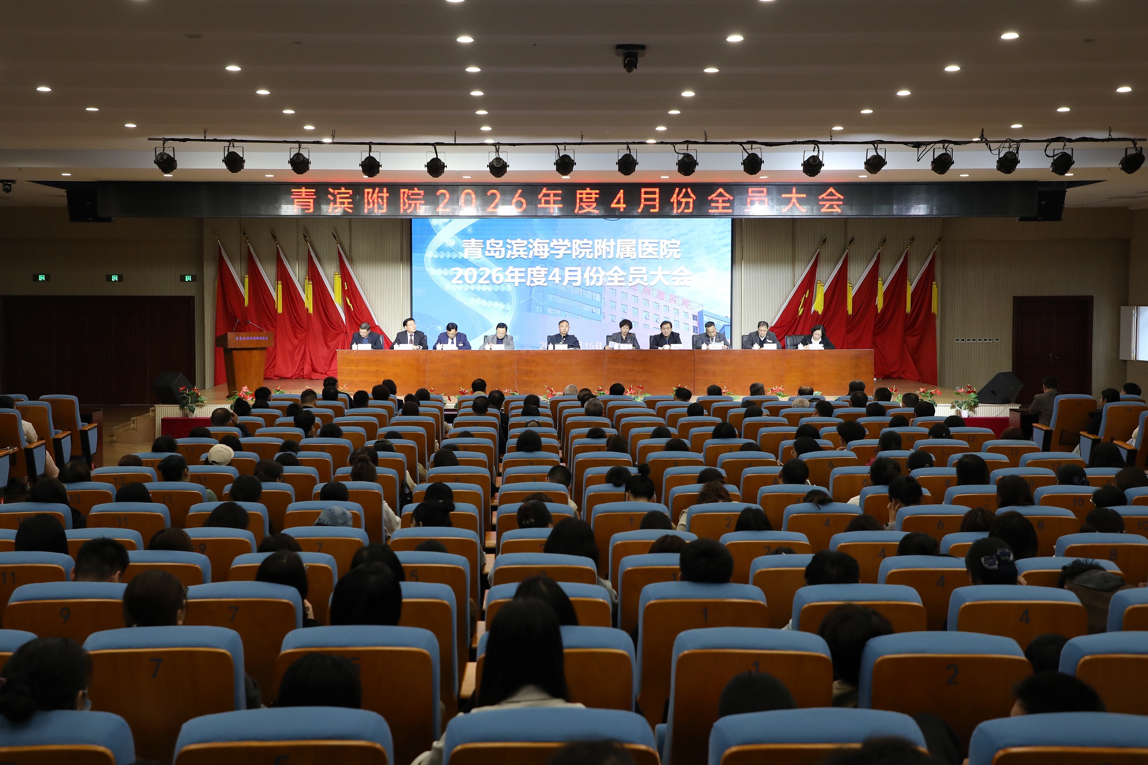 4月15日,青岛滨海学院附属医院召开2026年度4月份全员大会。医院创办人、院长韩方希出席并讲话,党委副书记、副院长明艳主持会议,副院长方政慧、金讯波,党委副书记王磊、副院长陈作雷等院领导班子出席会议。