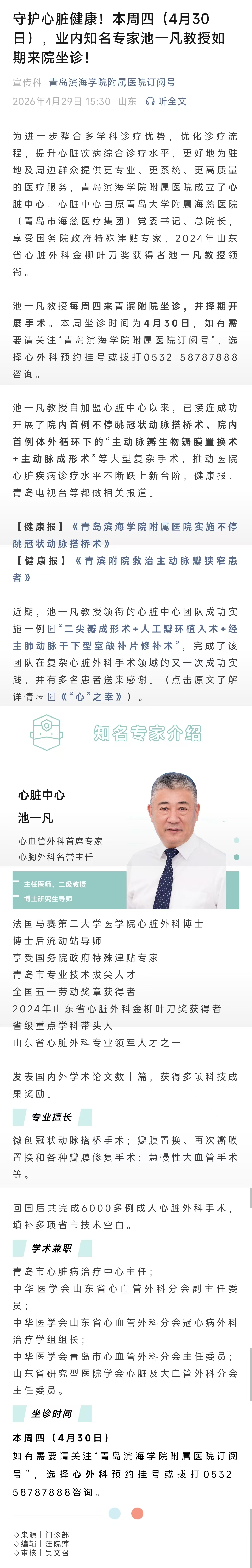 守护心脏健康!本周四(4月30日),业内知名专家池一凡教授如期来院坐诊!