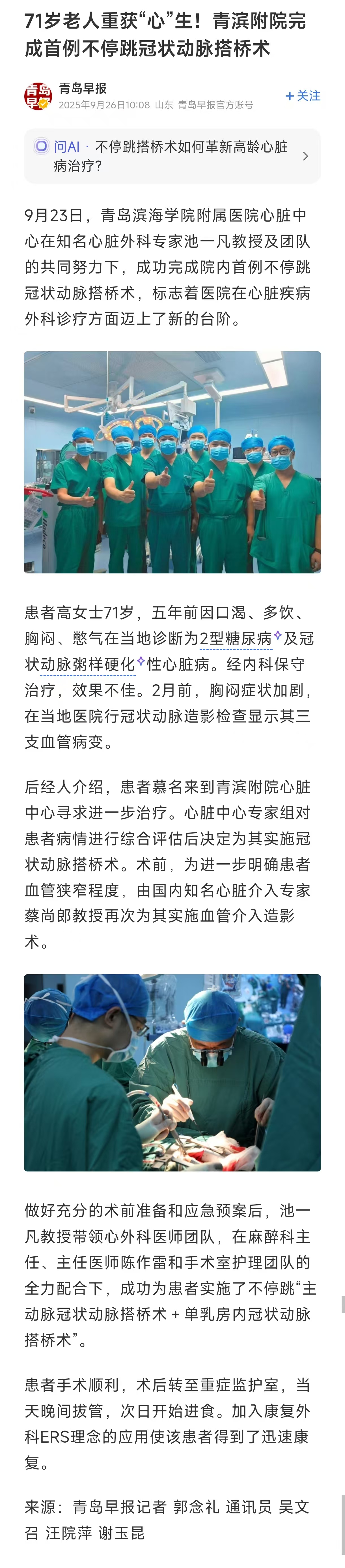 【青岛早报】71岁老人重获“心”生!青滨附院完成首例不停跳冠状动脉搭桥术