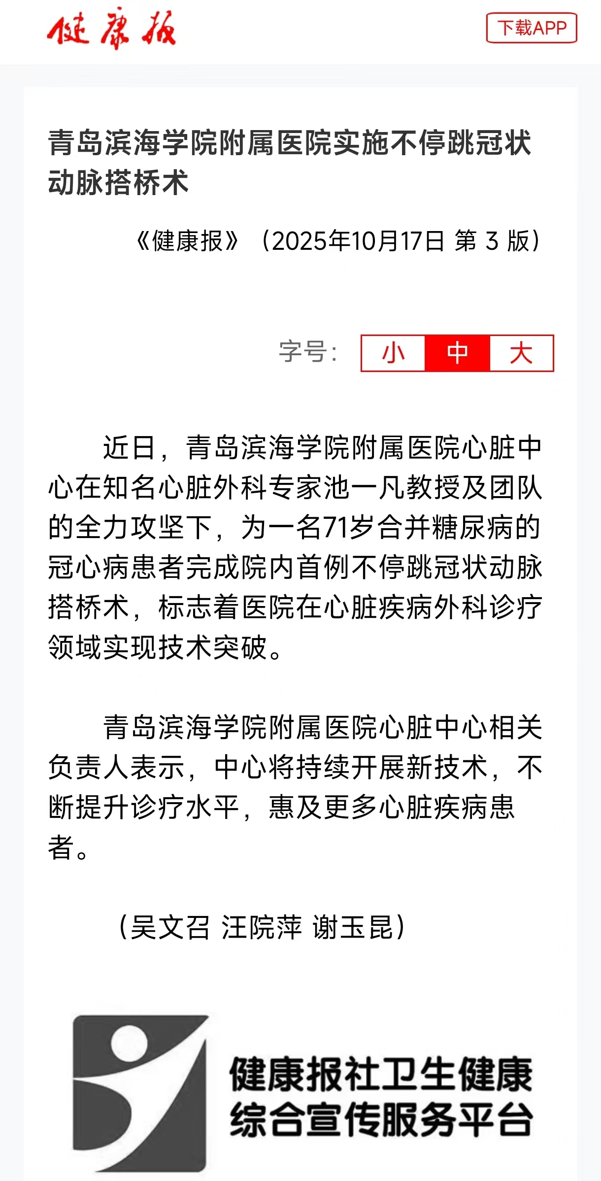 【健康报】青岛滨海学院附属医院实施不停跳冠状动脉搭桥术