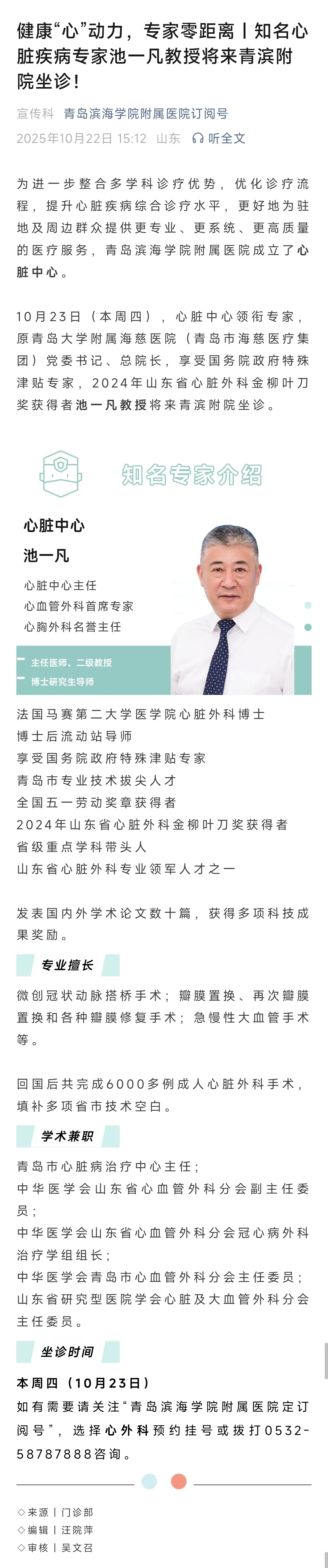 健康“心”动力,专家零距离|知名心脏疾病专家池一凡教授将来青滨附院坐诊!