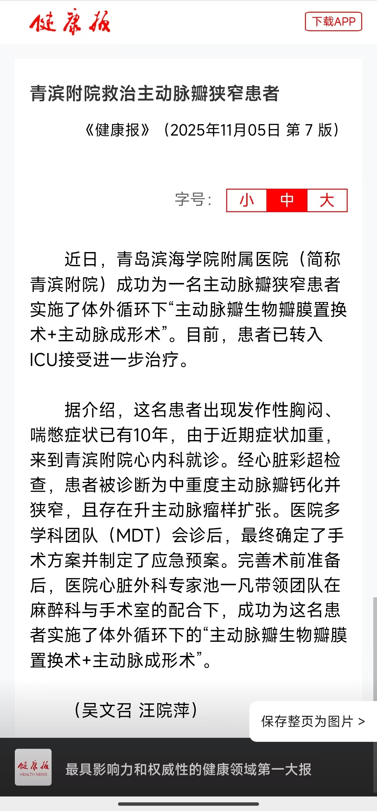 【健康报】青滨附院救治主动脉瓣狭窄患者