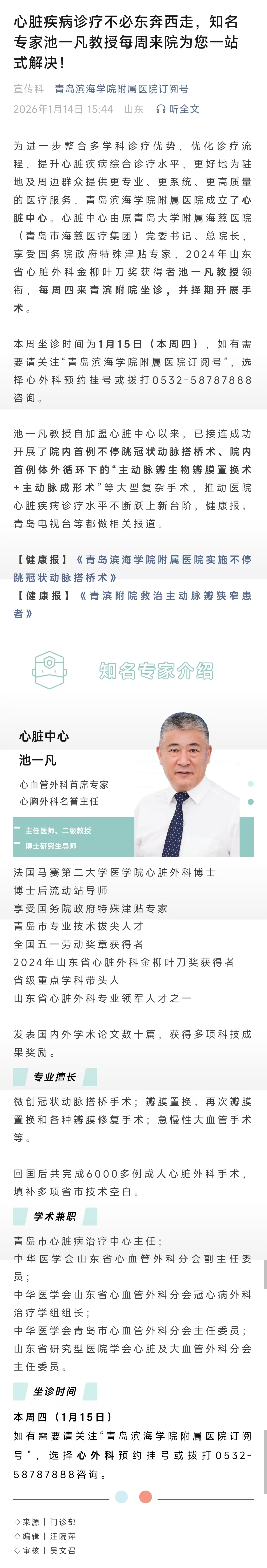 心脏疾病诊疗不必东奔西走,知名专家池一凡教授每周来院为您一站式解决!