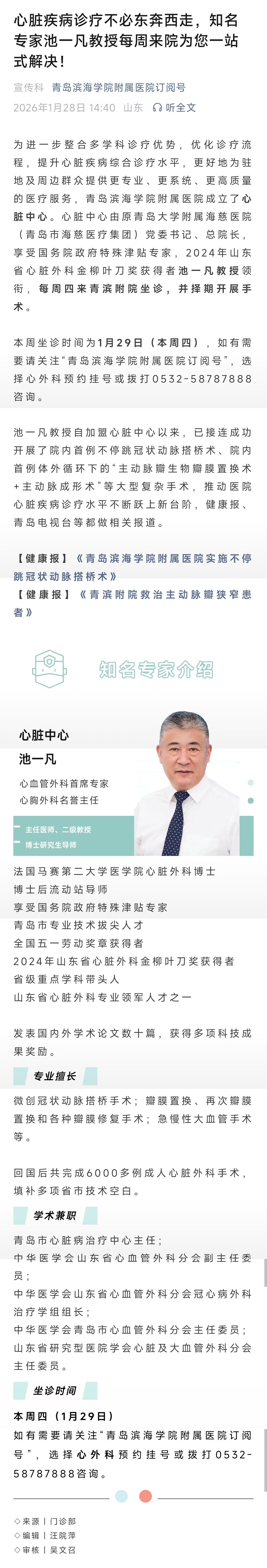心脏疾病诊疗不必东奔西走,知名专家池一凡教授每周来院为您一站式解决!