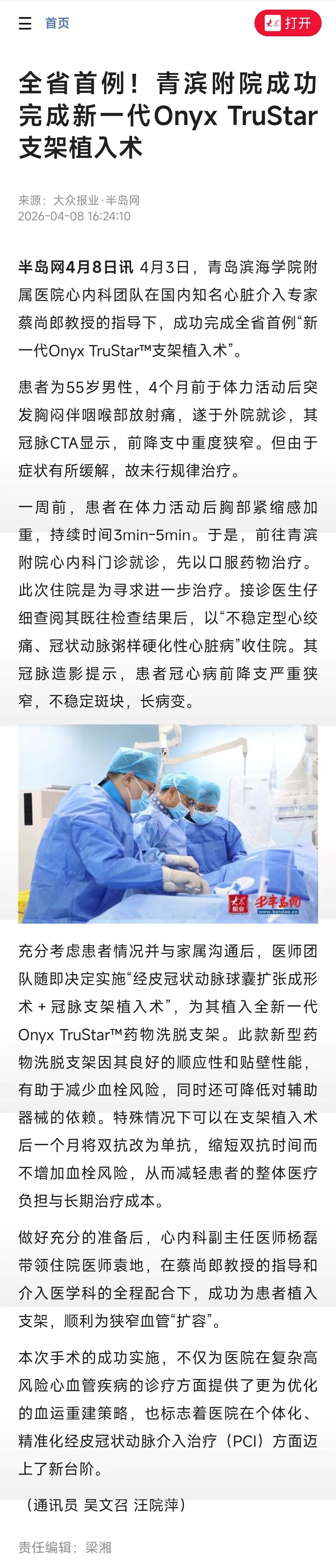 【半岛网】全省首例!青滨附院成功完成新一代Onyx TruStar?支架植入术