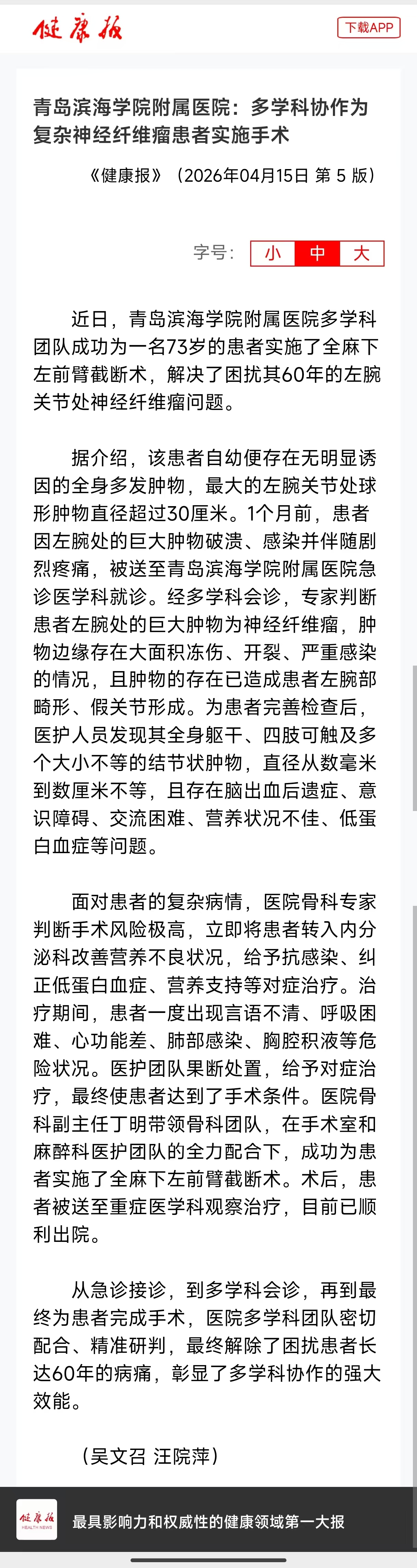 【健康报】青岛滨海学院附属医院:多学科协作为复杂神经纤维瘤患者实施手术